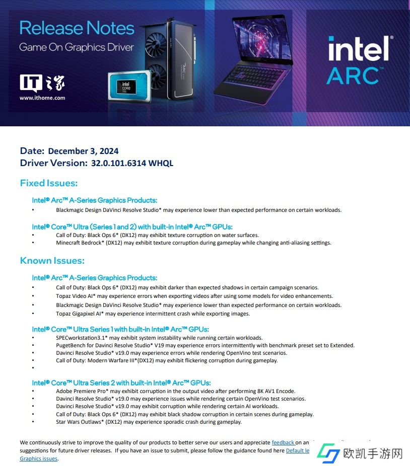 本站 12 月 4 日消息,英特尔刚刚发布了最新的 Arc 图形驱动程序,版本号为 101.6314 WHQL,但该版本尚未提供对“Battlemage”B500 系列显卡的支持,也没有 Game On 游戏优化,就只是修复了一些 Bug。