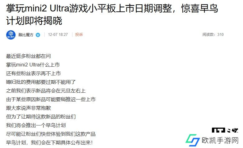 本站 12 月 7 日消息,酷比魔方今日宣布,掌玩 mini 2 Ultra 游戏小平板上市日期调整,惊喜早鸟计划即将揭晓。酷比魔方此前曾称新品将会在元旦左右上,由于某些原因新品可能要稍推迟一些上市。