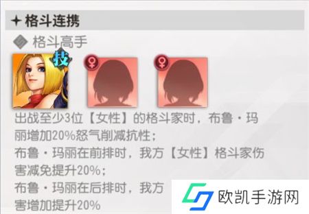 虽然理论上三位格斗家就可以激活连携,但是她的技能的buff是能给到全队的,所以纯妹妹队能够最大化的吃到玛丽格斗连携的效果加成。