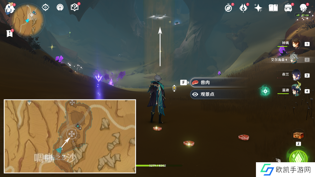8、我们借助风场,飞到最顶层,此时会来到秘境的旁边,顺着道路向南走,可以看到一个摩拉堆,与之交互就会出现一个洞口(第二个地洞)(尽量站边缘一点,不要掉下去最好)