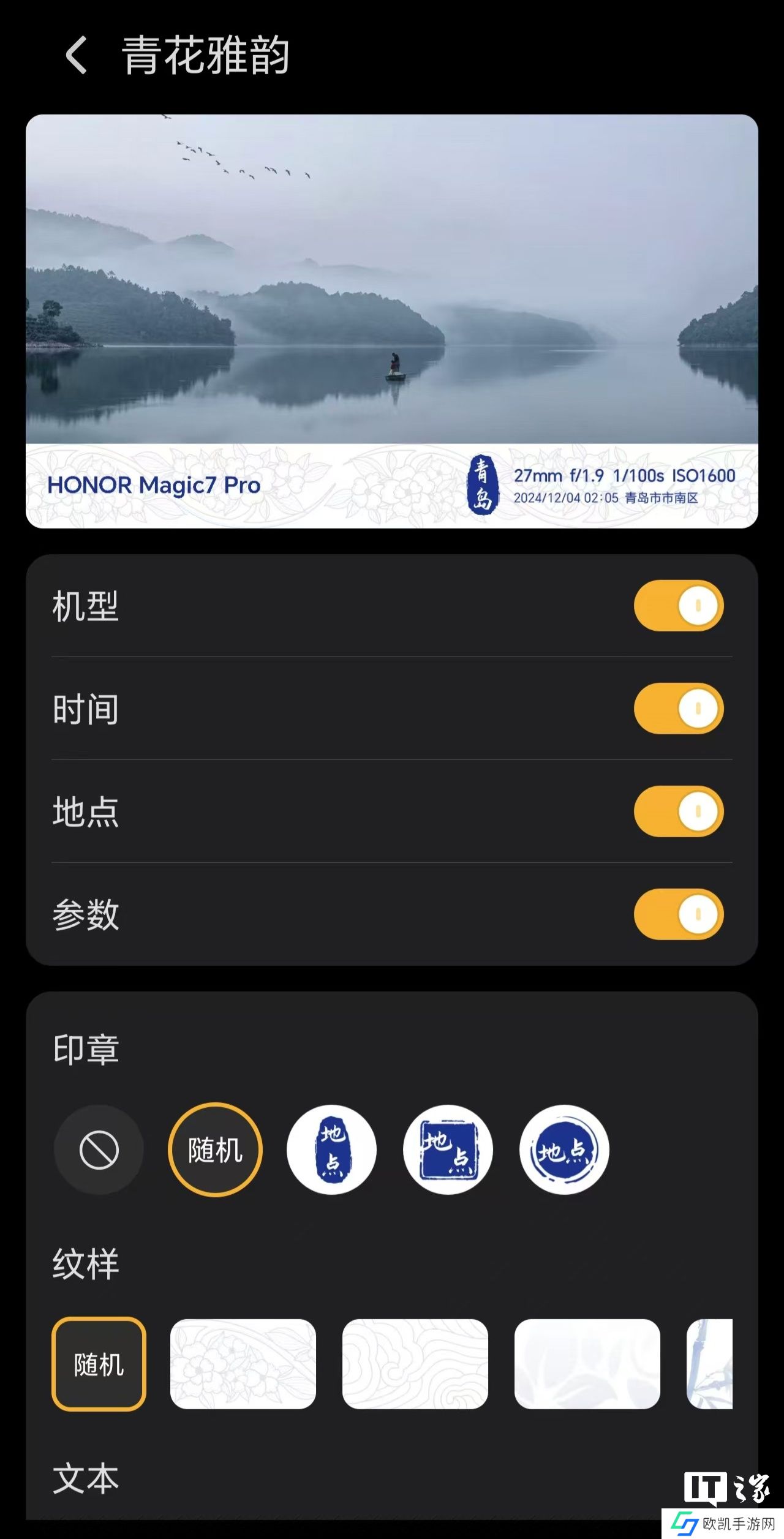 本站实测,“青花雅韵”相机水印支持印章、花纹、文本自定义,可设置随机展示效果;该款水印还可自由开关拍摄机型、时间、地点、参数等信息展示。需要注意的是,设置文本后,水印将自动去除拍摄参数信息。