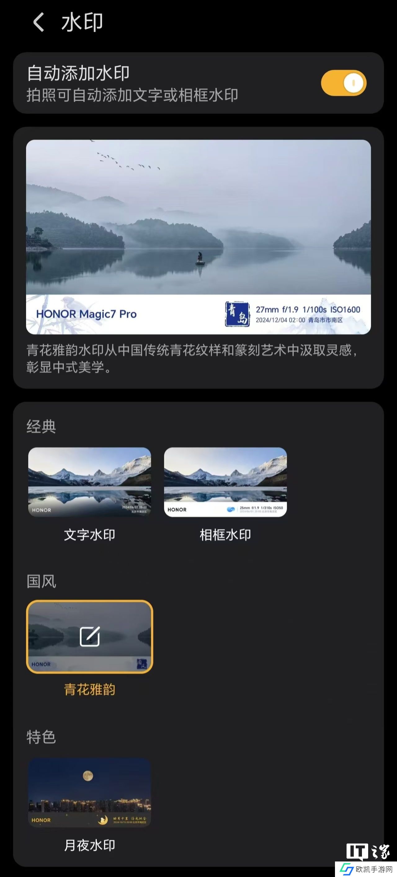 本站 12 月 4 日消息,荣耀手机已在今日凌晨上线“青花雅韵”相机水印,用户可在相机 App 设置中找到该水印并下载使用。