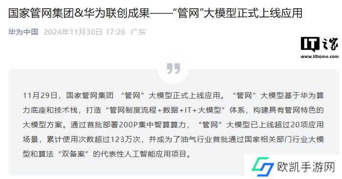 本站 11 月 30 日消息,据华为官方消息,11 月 29 日,国家管网集团“管网”大模型正式上线应用。“管网”大模型基于华为算力底座和技术栈,打造“管网制度流程 + 数据 + IT + 大模型”体系,构建具有管网特色的大模型方案。
