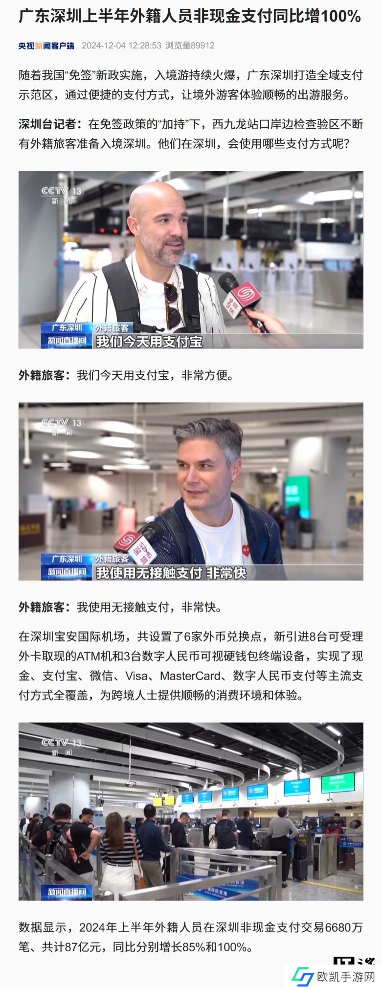本站 12 月 4 日消息,据央视新闻今日报道,2024 年上半年外籍人员在深圳非现金支付交易 6680 万笔、共计 87 亿元,同比分别增长 85% 和 100%。