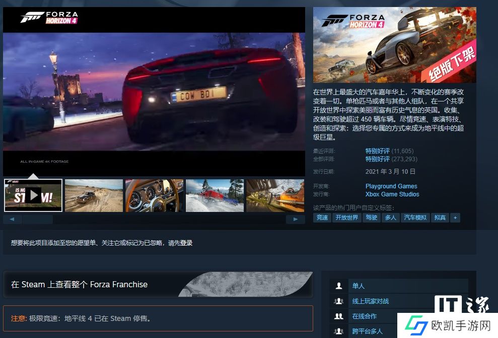 本站 12 月 16 日消息,《地平线》游戏官方今年 6 月宣布,由于与合作伙伴的授权和协议到期,《极限竞速:地平线 4》将于 2024 年 12 月 15 日开始从数字平台下架。本站查询发现,目前这款游戏已经在 Steam 平台停售。