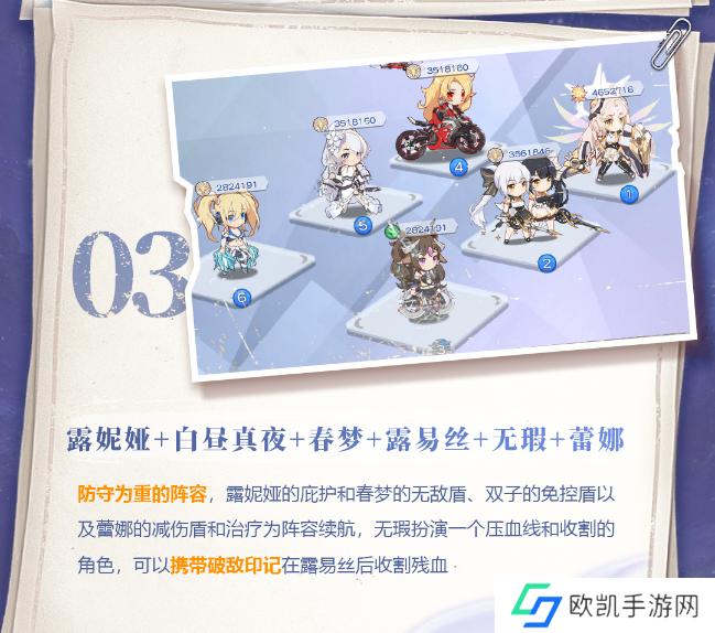 防守为重的阵容,露妮娅的庇护和春梦的无敌盾、双子的免控盾以及蕾娜的减伤盾和治疗为阵容续航,无瑕扮演一个压 血线和收割的角色,可以携带破敌印记在露易丝后收割残血。