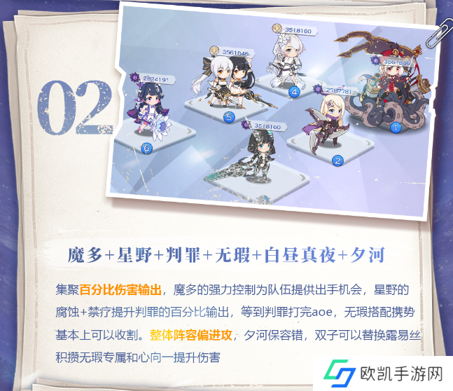 集聚百分比伤害输出,魔多的强力控制为队伍提供出手机会,星野的腐蚀+禁疗提升判罪的百分比输出,等到判罪打完aoe,无瑕搭配携势基本上可以收割。整体阵容偏进攻,夕河保容错,双子可以替换露易丝积攒无瑕专属和心向一提升伤害。