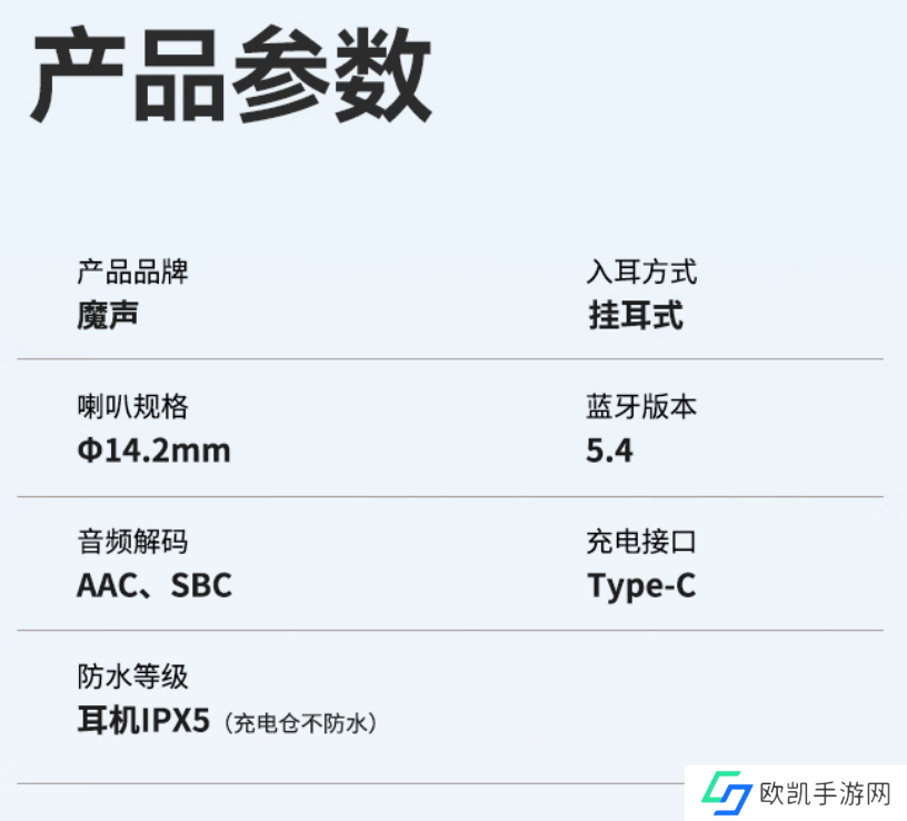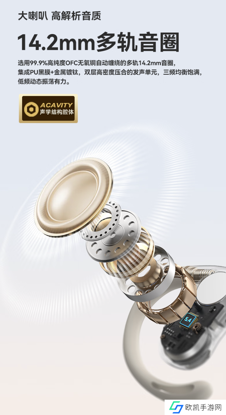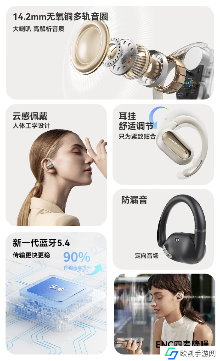 这款耳机配备14.2 mm音圈,支持ENC降噪技术及定向传音技术,使用蓝牙5.4 技术,耳机本体内置电池至高续航10小时,配合充电盒至高续航36小时。
