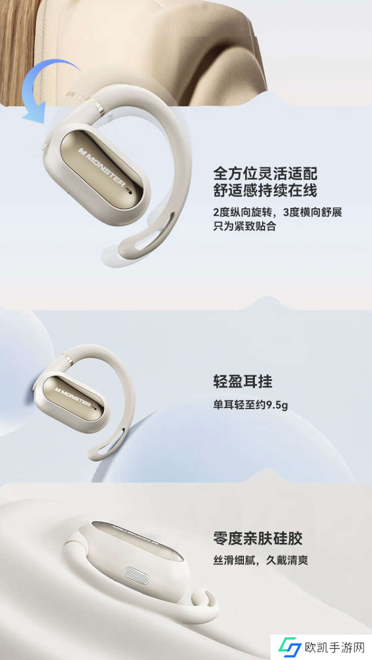 据介绍,这款耳机本体外覆硅胶,支持IPX5防水防尘,单只重量约9.5克,支持2度纵向旋转、3度横向舒展,适配不同耳形。