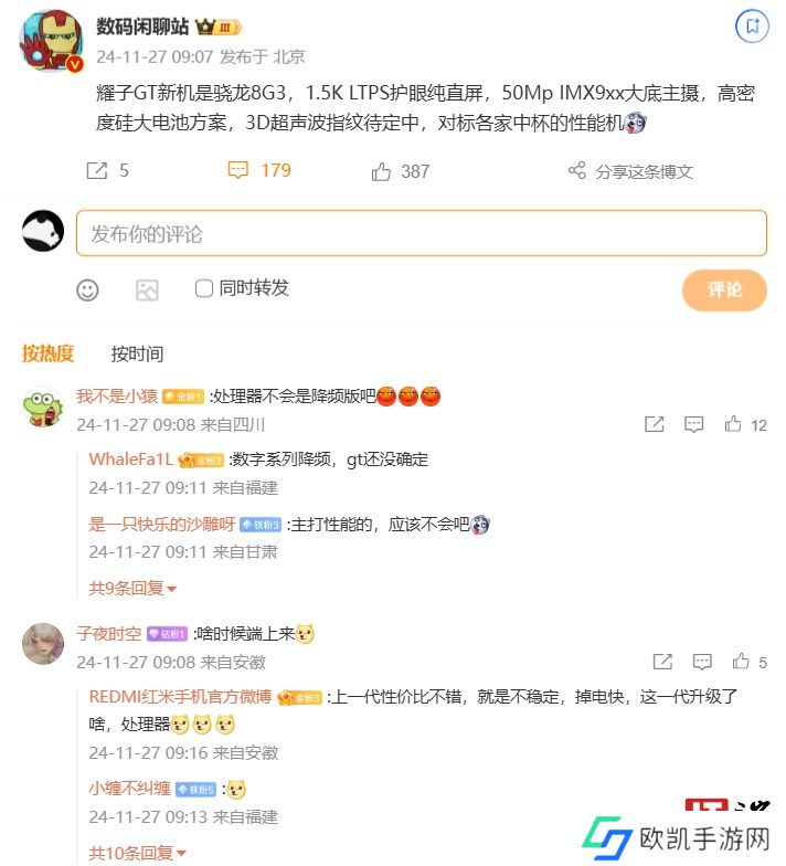 本站 11 月 27 日消息,博主@数码闲聊站 今日发文透露,荣耀 GT 新机将搭载骁龙 8 Gen3 处理器,配备 1.5K LTPS 护眼纯直屏,后置 50Mp IMX9xx 大底主摄。新机还将采用高密度硅大电池方案,3D 超声波指纹待定,对标各家中杯的性能机。