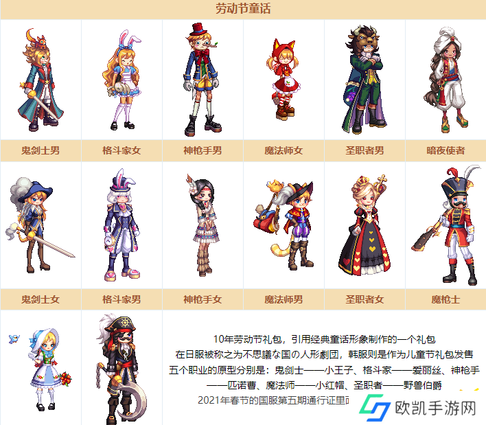 10年劳动节礼包,引用经典童话形象制作的一个礼包,在日服被称之为不思議な国の人形劇団,韩服则是作为儿童节礼包发售,五个职业的原型分别是:鬼剑士——小王子、格斗家——爱丽丝、神枪手——匹诺曹、魔法师——小红帽、圣职者——野兽伯爵,2021年春节的国服第五期通行证里面对其他职业进行了补完。