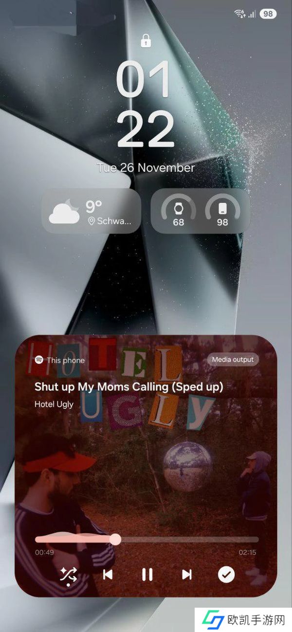 消息源还展示了锁屏界面中的全新媒体播放器,用户在药丸形小部件中可以控制暂停 / 下一首等控件,可以点击进入全屏界面。
