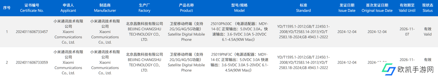 据本站今日早些时候报道,小米 15 Ultra 的两款新机已经于 12 月 4 日获得 3C 认证。数据显示,这两款新机支持 90W 充电,均为“卫星移动终端”,意味着其标配卫星通信。