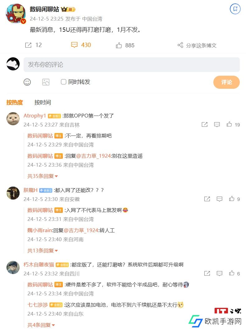 博主在评论区中回复了部分网友的问题:针对入网后还能改配置的问题,博主回复“入网了不代表马上就发”;针对新机打磨的方向问题,博主表示“硬件是差不多了,软件不能给个半成品吧,耐心等待”。