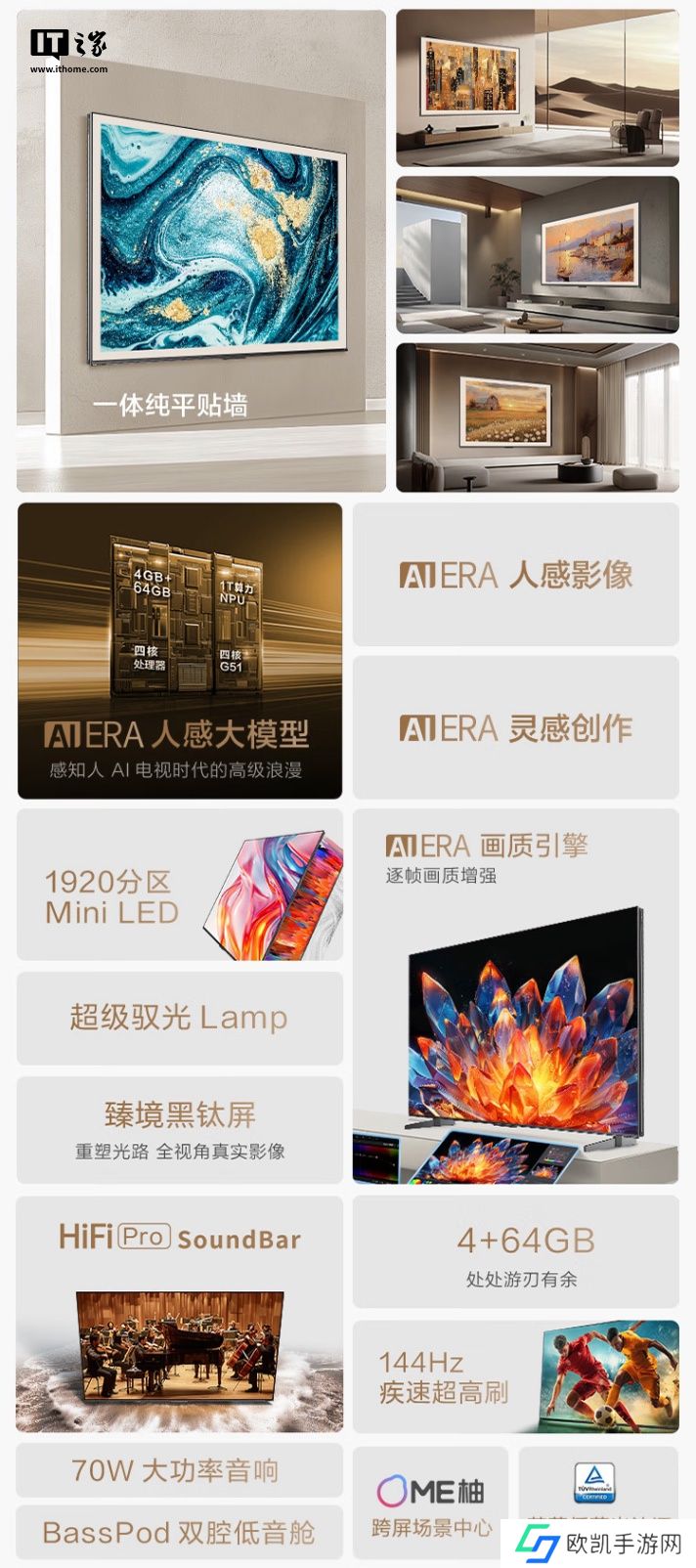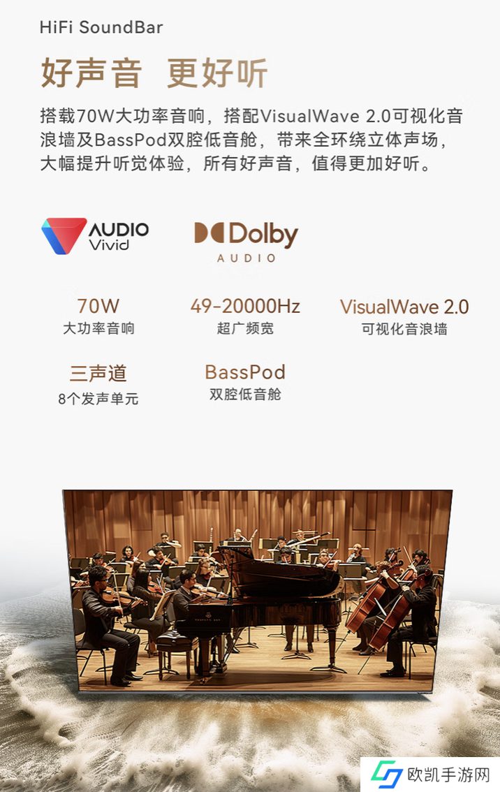 该机配备70W BassPod双腔低音舱音响系统,支持可视化音浪墙技术,内置四核心处理器、4GB RAM及64GB存储空间,同时配有 AIERA影像引擎技术。