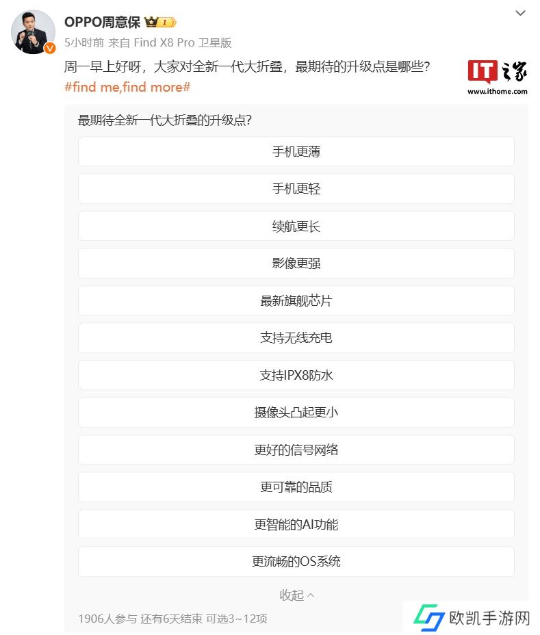 本站 12 月 17 日消息,OPPO Find N5 折叠屏手机目前已开启早期预热,OPPO Find 系列产品负责人周意保昨日发布“投票”,询问用户对于全新一代大折叠手机最期待的升级点,同时透露了全新一代大折叠屏手机发布时间为“春暖花开的季节”。