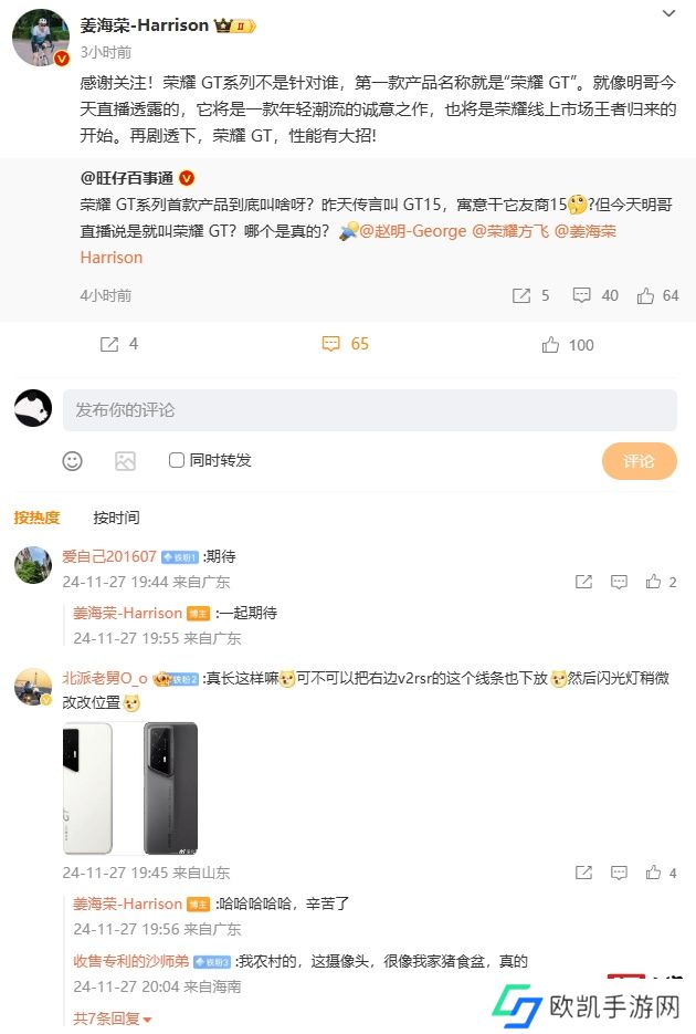 荣耀终端有限公司中国区 CMO 姜海荣今日发文回应了新系列机型命名问题:荣耀 GT 系列不是针对谁,第一款产品名称就是“荣耀 GT”。另外他还表示“新荣耀 GT,性能有大招”。
