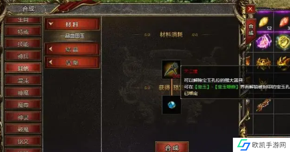 在合成系统中的材料界面,玩家可以利用天工锥来合成一品蓝田玉,进一步提高自己的战力。