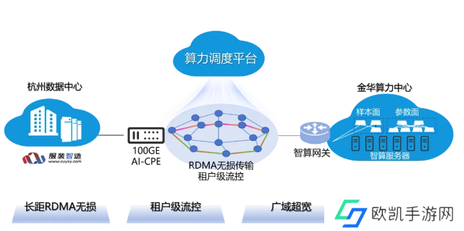 第一,以跨地市 AI 大模型训练能力创新重构智算训练模式。传统的智算集中训练模式,需要用户将样本上传到智算中心进行落盘训练,但是部分用户对隐私样本落盘存在安全顾虑。浙江联通通过 IP 广域无损方案,实现了杭州存、金华训的“数据不落盘”拉远训练,以算网协同的能力,为企业用户隐私样本训练探索出了一条新路。