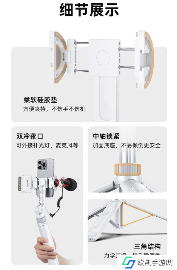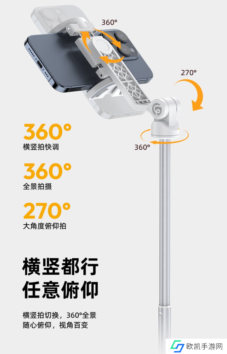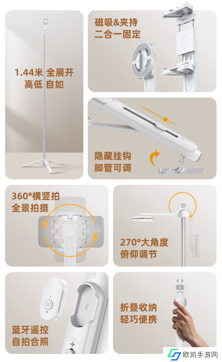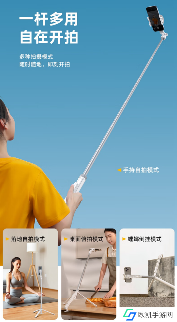 该款自拍杆支持 360° 横竖拍调节、360° 全景拍摄、270° 角度俯仰拍;新品采用折叠隐藏式挂钩设计、脚架宽度 410mm,提供手持自拍、落地自拍、桌面俯拍、螳螂倒挂等拍摄模式。其中桌面俯拍模式承重<500g、螳螂倒挂模式适用于屏幕厚度<110mm 平面。