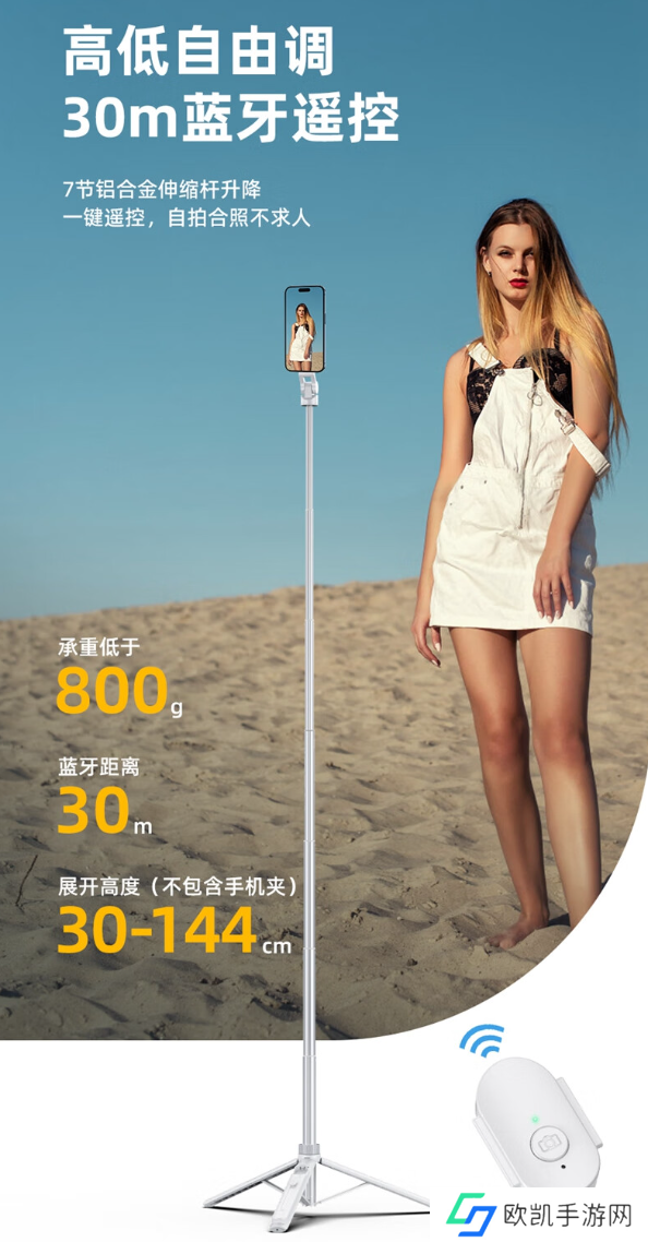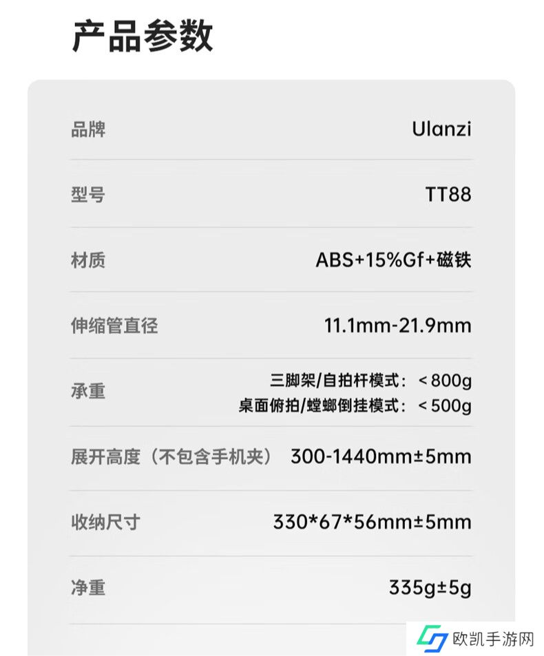 优篮子俯拍自拍杆 TT88 重约 335g、收纳长度 33cm;自拍杆支持 30-144cm 展开高度调节(不包含手机夹)、承重低于 800g、蓝牙距离 30m。