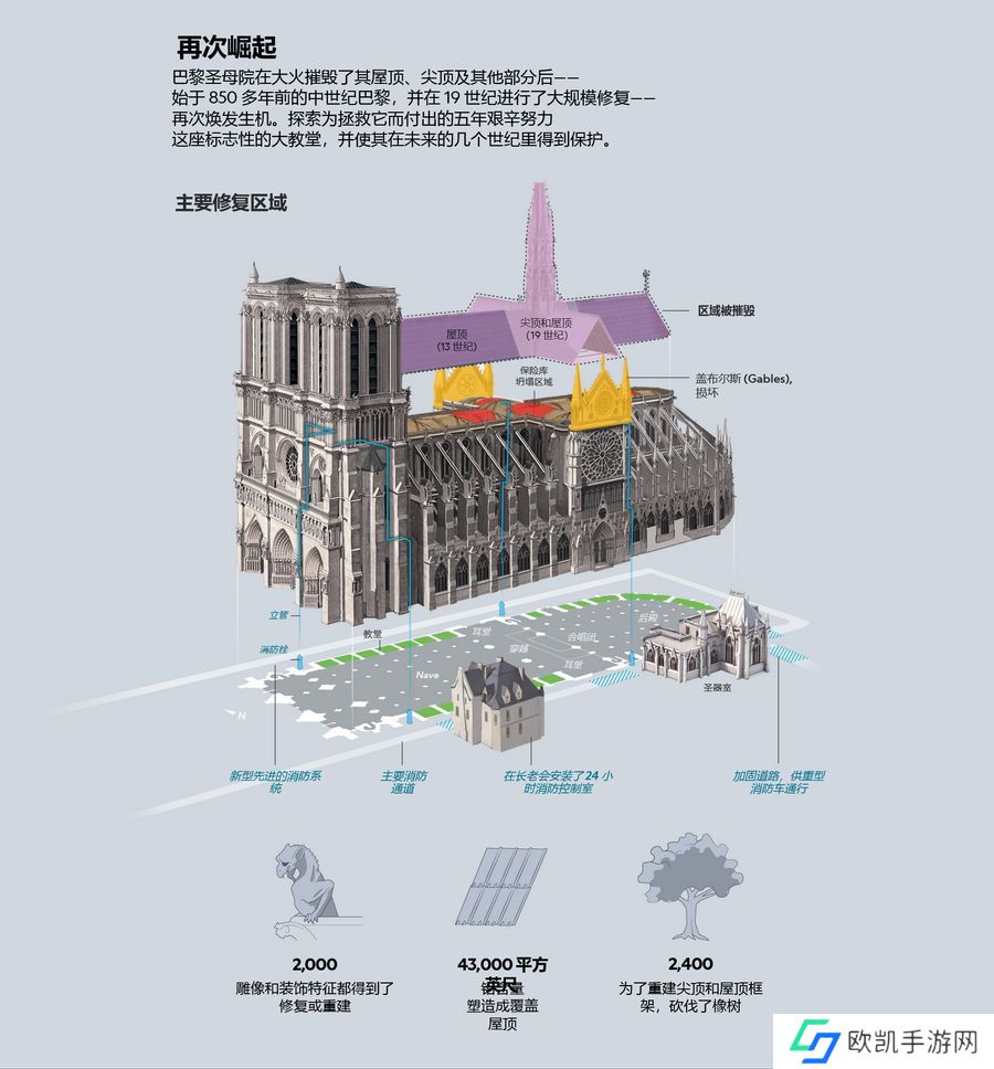 巴黎**院于 2019 年 4 月 15 日遭遇大火,尖顶倒塌,铅制屋顶融化,400 多名消防员彻夜奋战,最终控制火势。
