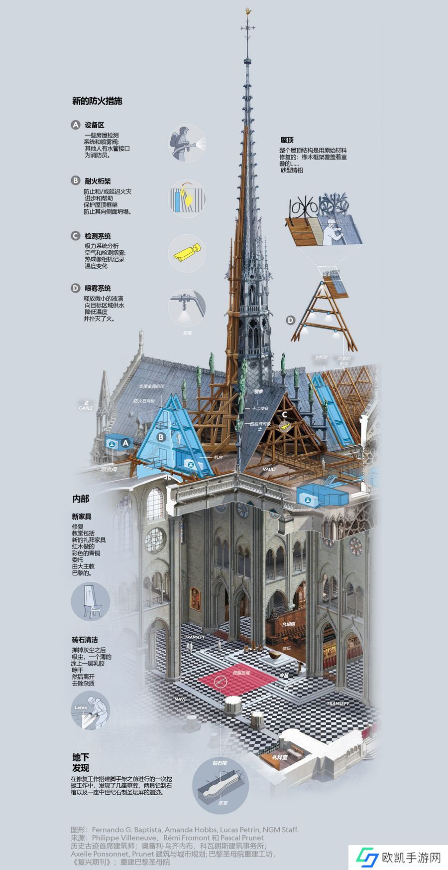 屋顶和阁楼采用新的手工榫卯结构木桁架重建,并增加了防火桁架,将尖顶和耳堂与中殿和唱诗班隔离开来,防止火势蔓延。同时,阁楼安装了喷雾器,可以第一时间抑制火情。