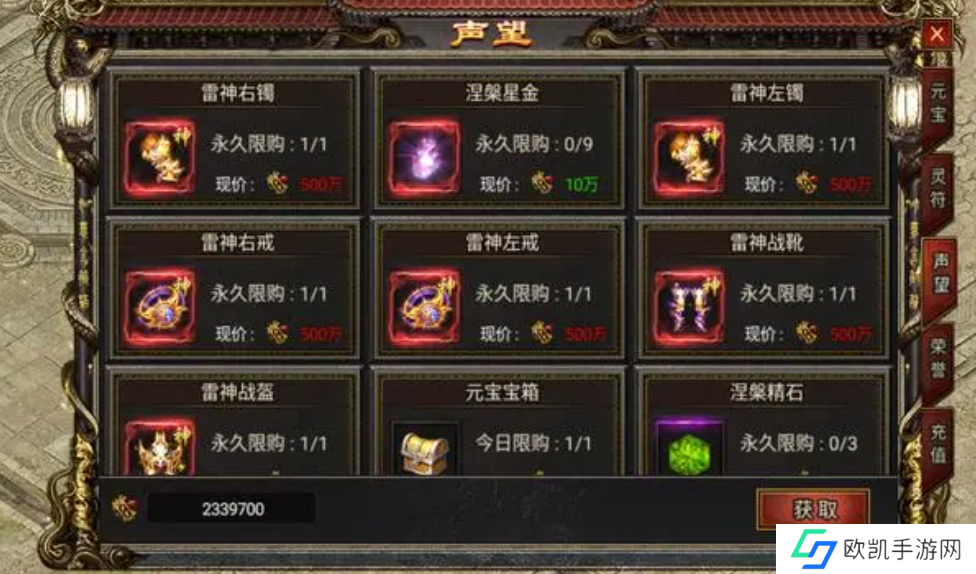 在世界boss的遗迹中击败第三层以上的boss,可以获得免费的声望值。需要累积500万声望值才能获得雷神头盔。每天可以挑战遗迹boss最多6次,每次可以获得5000声望值,大约需要100多天的时间才能凑齐所需声望。