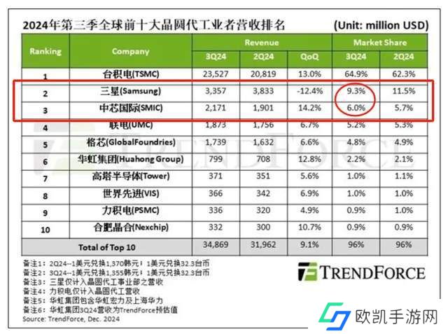 按照前段时间机构的数据,我们可以看到,到三季度时,三星在代工市场的份额只有9.3%了,离中芯国际只有3.3%的比例了,且是前十在中唯一下滑的企业。