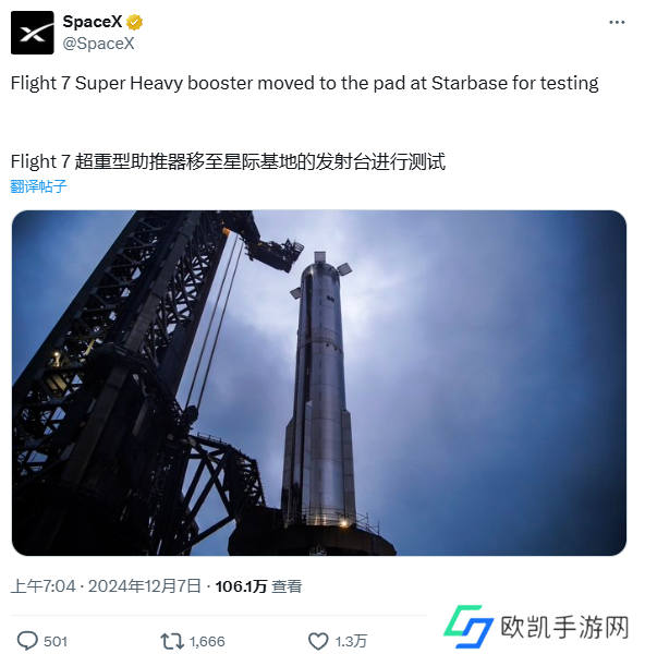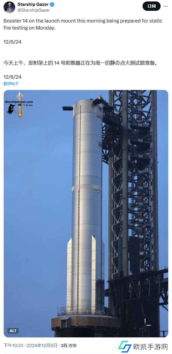SpaceX 星舰(Starship)第七次飞行试验任务将使用的 Booster 14 超重型助推器已经竖上发射台,为下周一的静态点火测试做好准备。