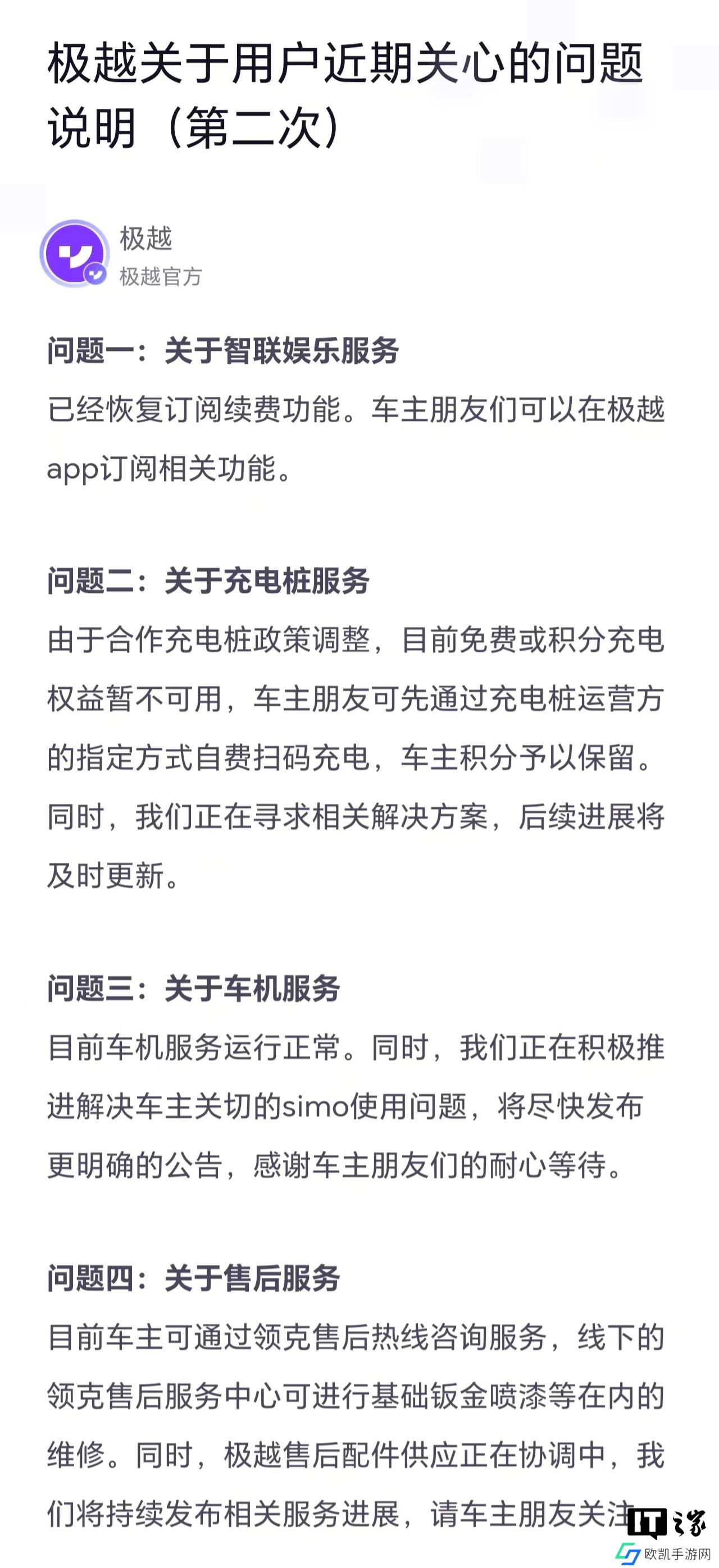本站 12 月 18 日消息,极越今晚在官方 App 发布“极越关于用户近期关心的问题说明(第二次)”,回应了关于智联娱乐、充电桩、车机、售后等服务问题。