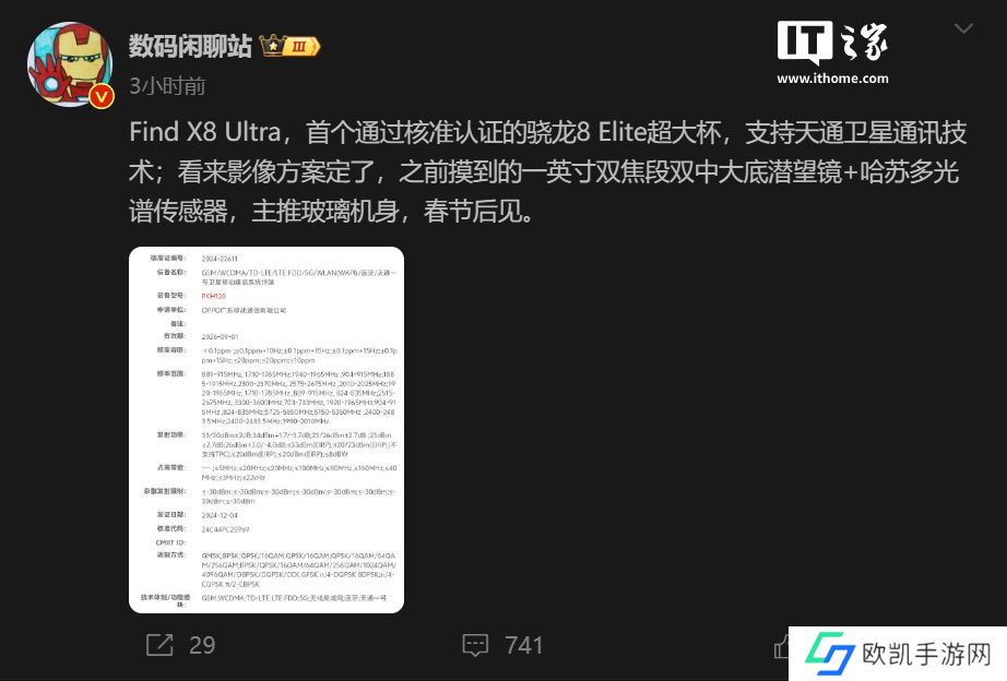 据博主 @数码闲聊站 爆料,OPPO Find X8 Ultra 首个通过核准认证的骁龙 8 Elite 超大杯手机,该机支持天通卫星通讯技术,影像方案为 1 英寸超大底主摄、双焦段双中大底潜望长焦 + 哈苏多光谱传感器,该机主推玻璃机身,将于春节后发布。