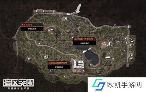 2、封锁区模式:通信站院内、北山酒店南部停车场、污水处理厂西侧院内。