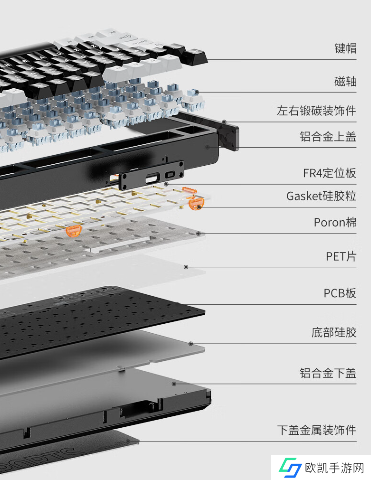 该款键盘提供佳达隆磁玉轴 Pro、达尔优天空磁轴、达尔优大师磁轴可选,外壳采用全铝 CNC(白色款:CNC 铝合金电泳;黑色款:CNC 铝合金 150 目;沙漠金:CNC 铝合金 220 目)。