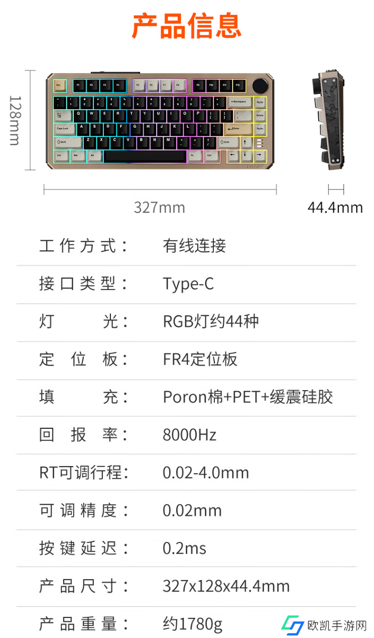 达尔优A75HE 电竞磁轴键盘搭载 40 多种 RGB 灯光效果,支持5 档亮度可调。键盘使用 Gasket 结构,配备音量调节旋钮、拥有 3 颗独立指示灯。