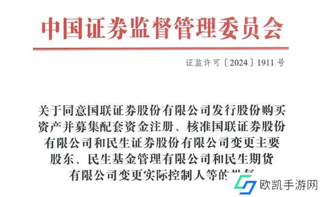 12月28日讯(记者 王婉莹)昨日晚间,证监会发布《关于同意国联证券股份有限公司发行股份购买资产并募集配套资金注册、核准国联证券股份有限公司和民生证券股份有限公司变更主要股东、民生基金管理有限公司和民生期货有限公司变更实际控制人等的批复》。这意味着,行业首单券商重组注册获批,“国联证券+民生证券”合并整合进入正式实施阶段。