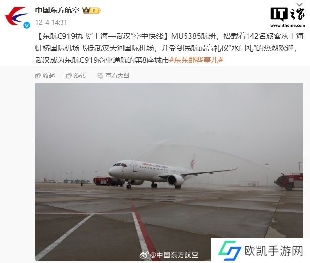 12 月 4 日,东航 MU5385 航班搭载着 142 名旅客从上海虹桥国际机场飞抵武汉天河国际机场,并受到民航最高礼仪“水门礼”的热烈欢迎,武汉成为东航 C919 商业通航的第 8 座城市。