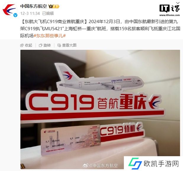 12 月 3 日,由中国东航最新引进的第九架 C919 执飞 MU5421“上海虹桥 — 重庆”航班,搭载 159 名旅客顺利飞抵重庆江北国际机场。