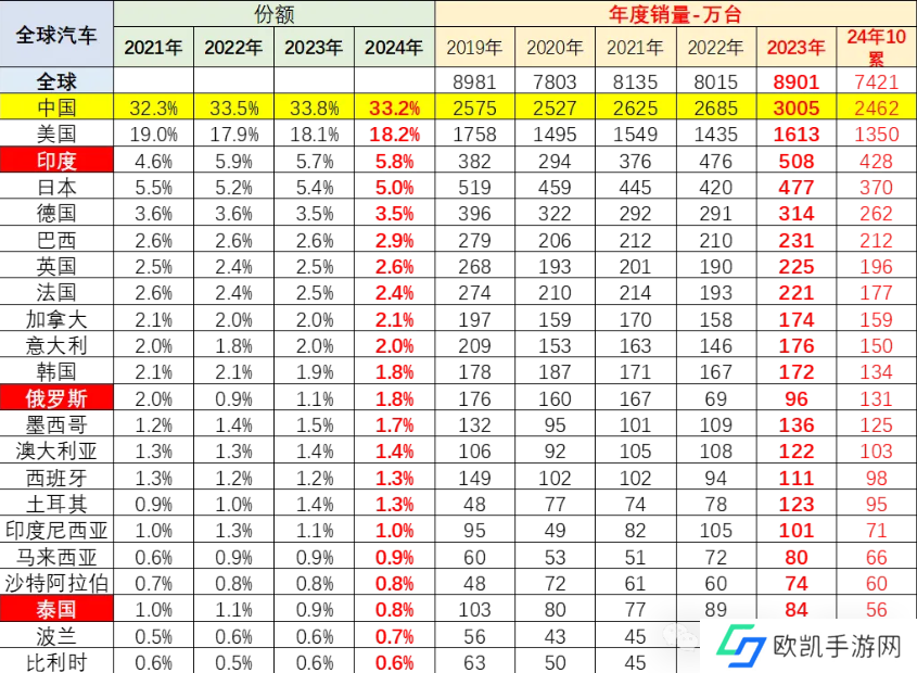 2023 年中国份额保持在 34%,其中年初较低是春节因素和车购税优惠政策退出的正常体现,随后中国 2024 年 1-10 月达到 33% 的份额,主要因 2 月春节因素偏低。今年北欧洲市场份额全面回升,南半球市场走势较强。本站获悉,崔东树称今年中国车市呈“前低后高”之势,目前在份额 33.2% 左右。