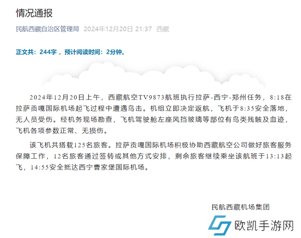 12月20日21时37分,民航西藏自治区管理局发布情况通报,12月20日上午,西藏航空TV9873航班执行拉萨—西宁—郑州任务,8时18分在拉萨贡嘎国际机场起飞过程中遭遇鸟击。