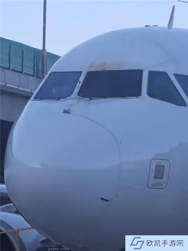 网友发布的现场视频显示,飞机左侧前挡风玻璃上有红色血迹,有机物人员正在检查飞机状态。
