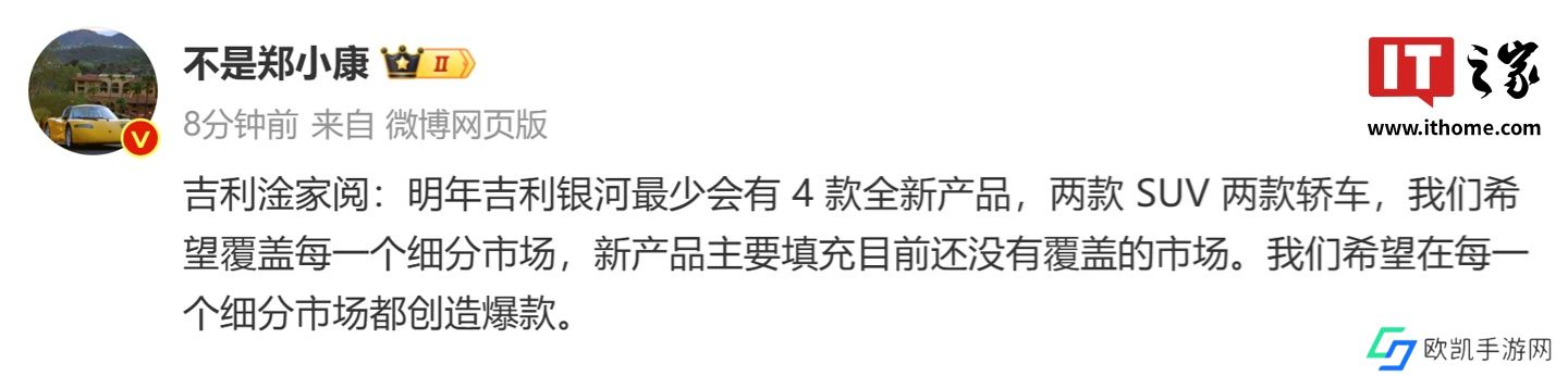 本站 12 月 6 日消息,据博主 @不是郑小康 消息,吉利汽车集团 CEO、吉利汽车控股有限公司执行董事淦家阅透露,明年吉利银河最少会有 4 款全新产品,两款 SUV 两款轿车。