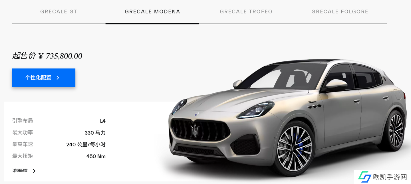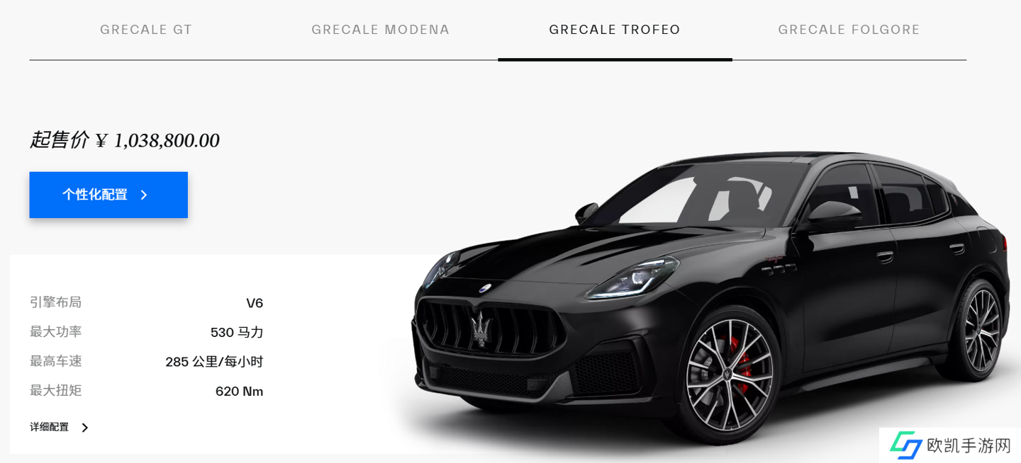 动力方面,2024 款玛莎拉蒂 Grecale Modena 版搭载 2.0 升涡轮增压发动机,匹配 48 伏轻混动力系统,最大功率为 243 千瓦、峰值扭矩为 450 牛・米;Grecale Trofeo 版搭载 3.0 升 V6 涡轮增压发动机,最大功率为 390 千瓦,峰值扭矩为 620 牛・米。传动系统均匹配 8 速手自一体变速箱,搭载适时四驱系统。