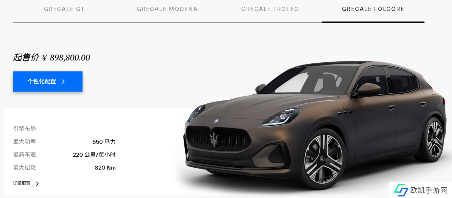 2025 款玛莎拉蒂 Grecale Folgore 基于 400 伏电气平台打造,电池组容量保持为 105 千瓦时,双电机综合最大功率 410 千瓦,峰值扭矩 820 牛・米,最高车速 220 公里 / 小时,CLTC 纯电续航里程为 533 公里,官方标称的 0-100 公里 / 小时加速时间为 4.1 秒。