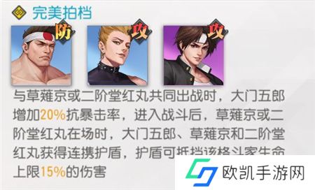 至于最后,二阶堂红丸主要是易于获取并且可以激活不少羁绊,而草薙京作为前期对灼烧队的大核自然无需多说。在其他队友的增益辅助下,他的输出能力绝对是是不容小觑的。