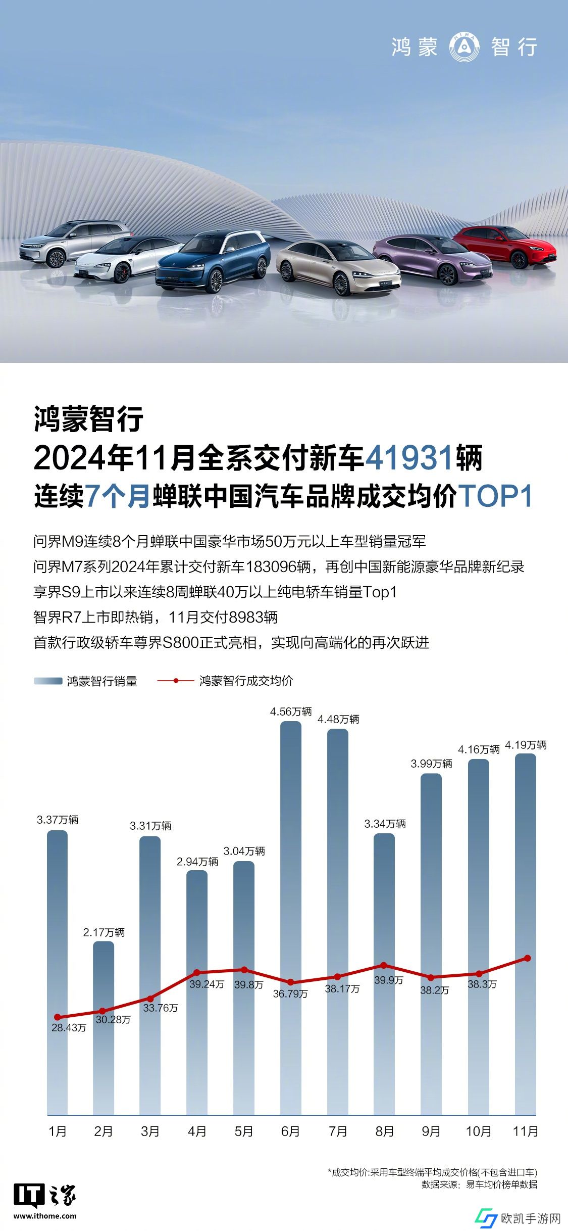 本站 12 月 1 日消息,鸿蒙智行今日发文官宣,2024 年 11 月鸿蒙智行全系交付新车超 4.1 万辆(41,931 辆),连续 7 个月蝉联中国汽车品牌成交均价 TOP1。