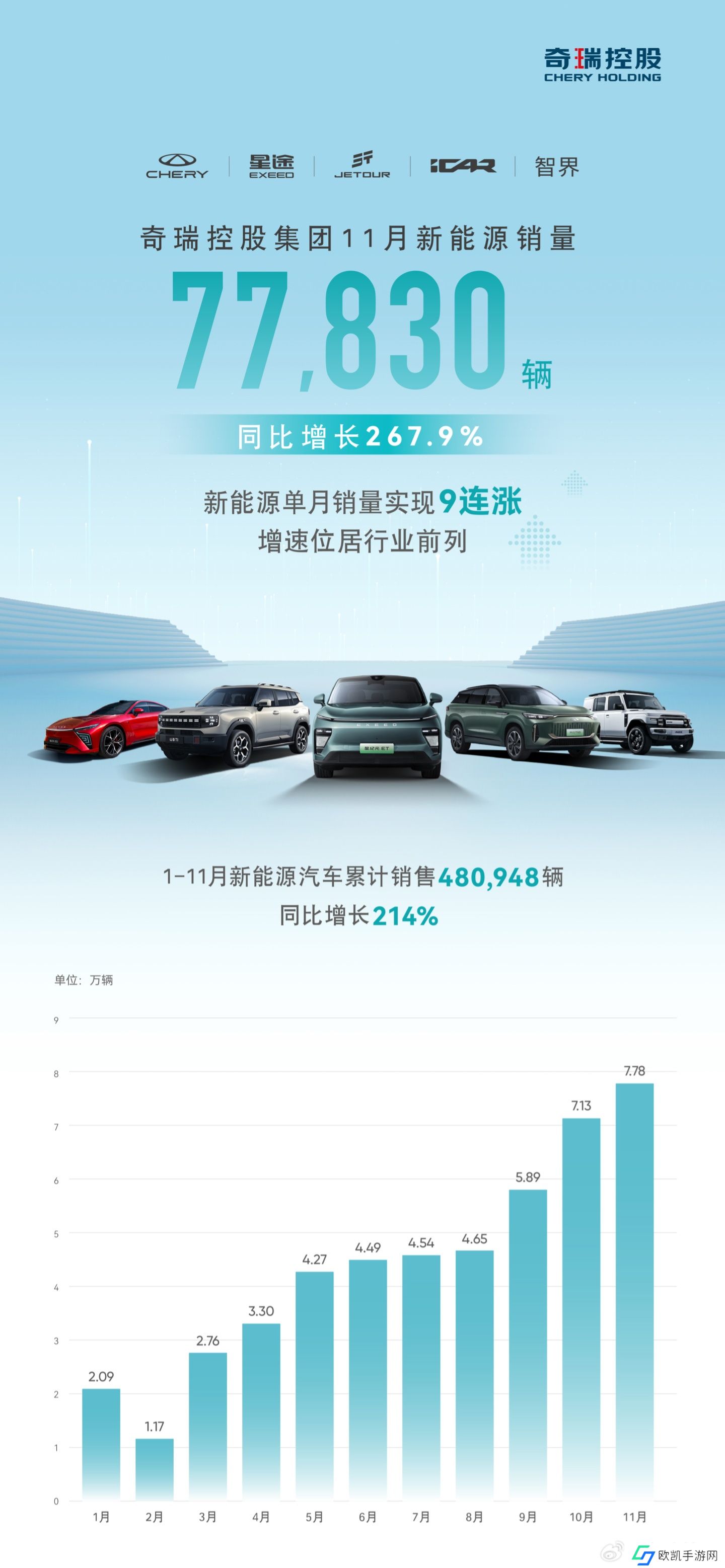 本站 12 月 1 日消息,奇瑞控股集团今年11 月新能源汽车销量 77,830 辆,同比增长 267.9%;1-11 月新能源汽车累计销售 480,948 辆,同比增长 214%。