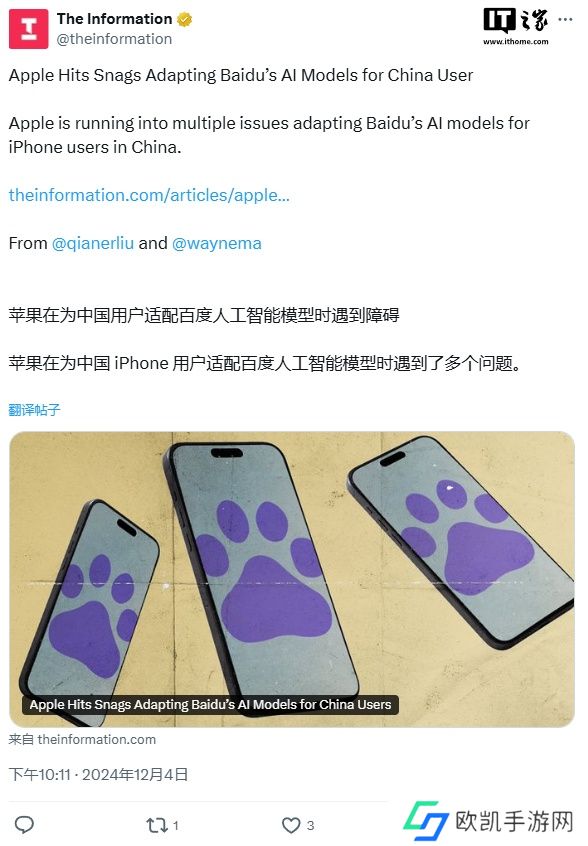 本站 12 月 4 日消息,The Information 报道称,苹果在为中国 iPhone 用户适配百度 AI 模型时遇到了困难。