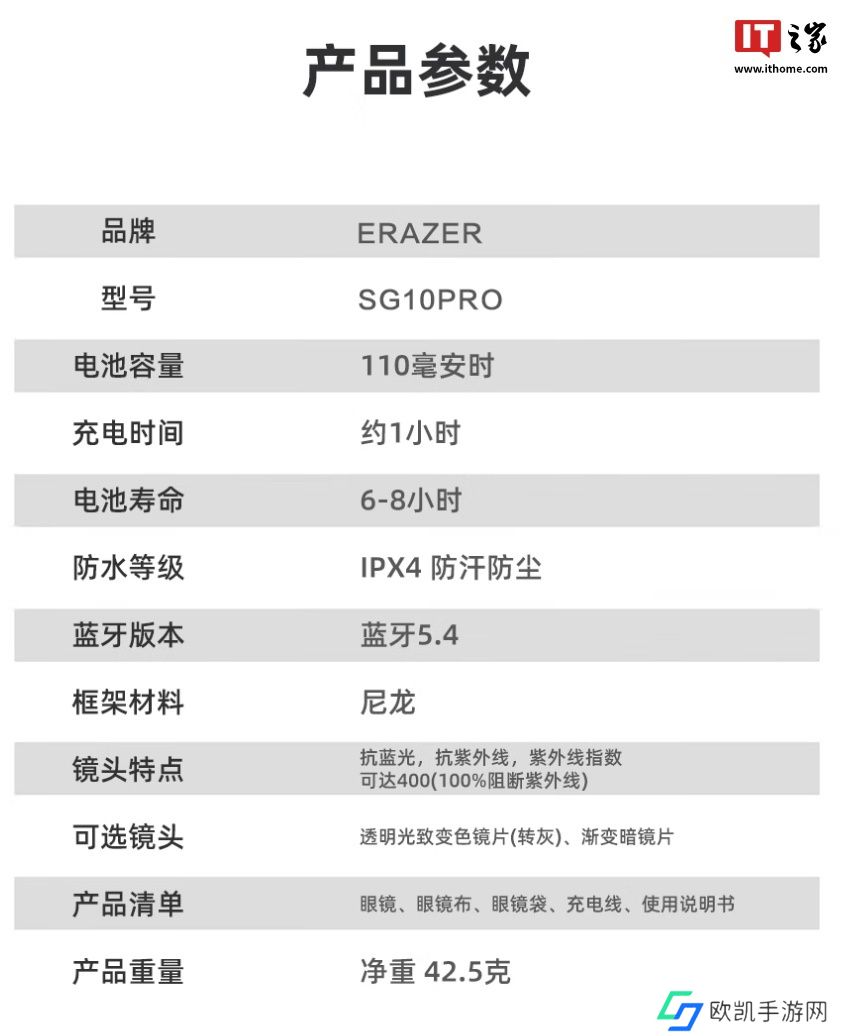 这款音乐眼镜采用黑色镜架,配备镀膜技术变色镜片,防蓝光和紫外线,整体重量42.59克,支持IPX4防尘,采用 SBS2.0 双悬挂架构,内置动态平衡单元,支持通话降噪,使用蓝牙5.4技术。