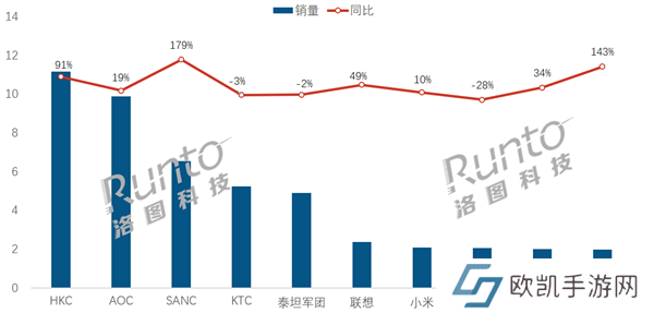 具体来看,在当月线上零售量方面,HKC超过了11万台,同比增长超过90%,在线上市场的份额达到了17.1%,相比去年同期提升了5.7个百分点。紧随其后的是AOC,排名当月线上销量第二名,零售量接近10万台,同比增长约20%。